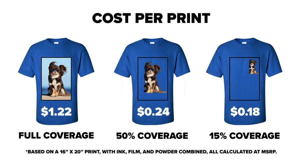 Below is an example of the cost per print for the G6070 & G9070 based on a 16″ x 20″ Print (with ink, film, and powder combined). All calculated at MSRP.