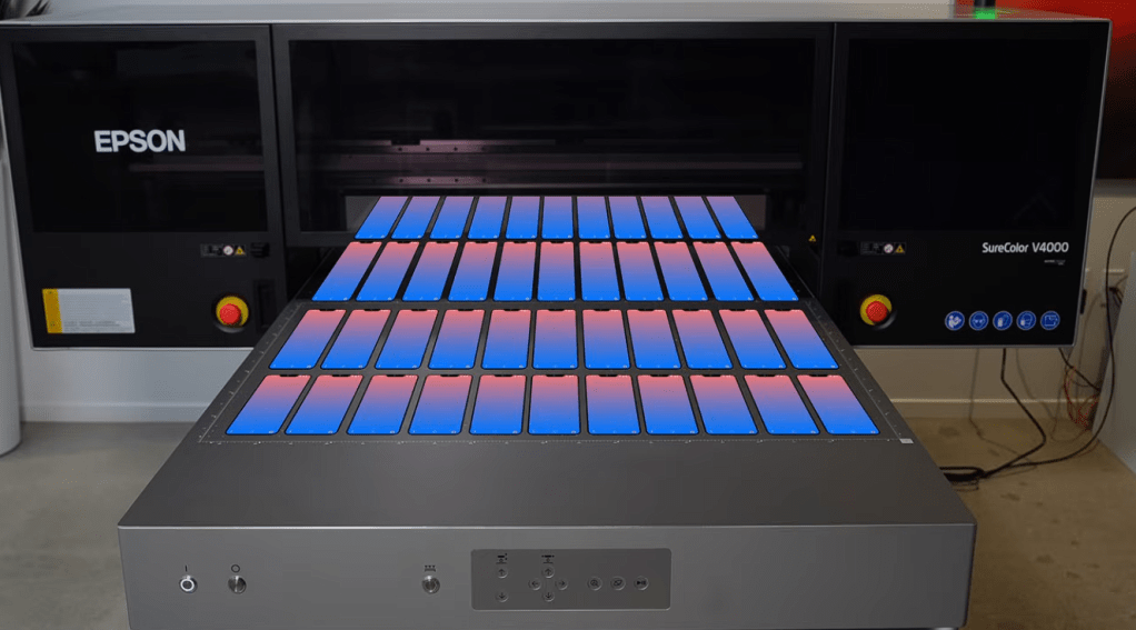 Instead of printing one phone case, then resetting, then printing another, operators are filling full beds and running repeatable output cycles throughout the day.